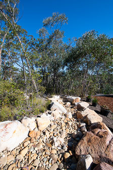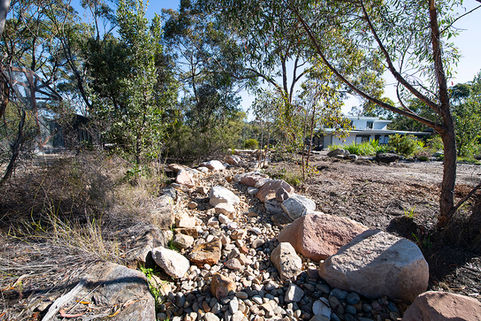 Creekbed and pathways: A dry stone creekbed and drainage channel runs through the garden with timber decking bridges and walkways creating a connection to gravel paths and a central fire pit area which creates a natural flow between spaces.