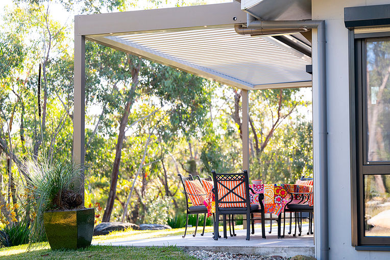 The Smartblade pergola was selected for its sleek design and motorised louvre blades, offering full control of light, shade and ventilation for all-weather entertaining.